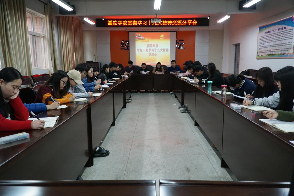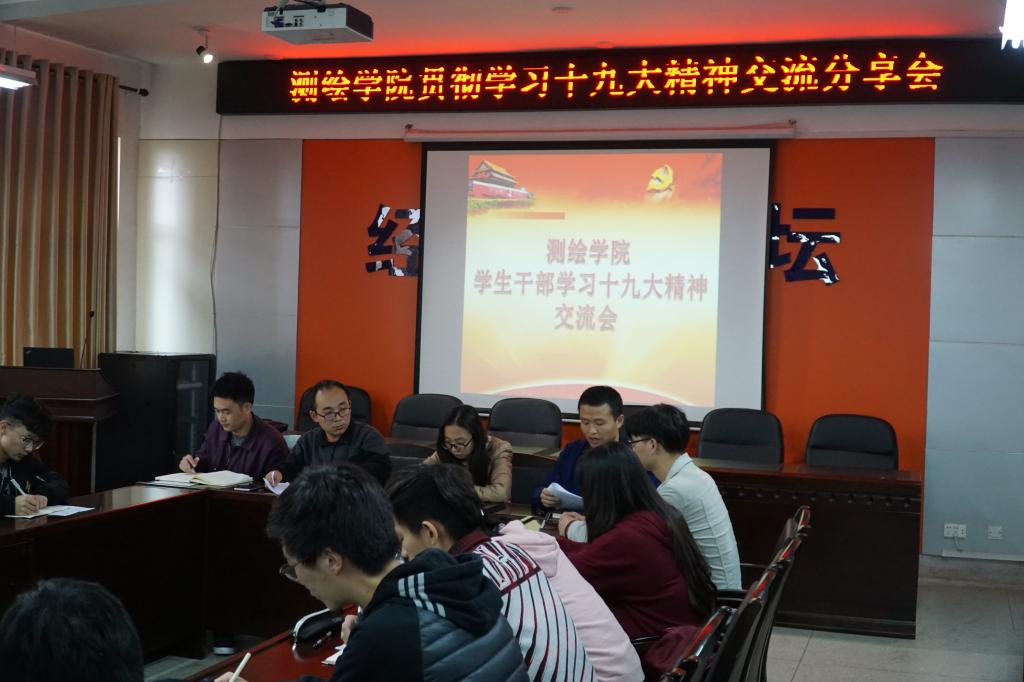 2017年11月9日,测绘学院在院会议室召开“贯彻学习十九大精神交流分享会。”会议由学院团委书记吴映曈主持,院团委副书记张雷、2016级辅导员张扬、2017级辅导员郭江波及测绘学院分团委学生会全体学生干部参加了此次大会。