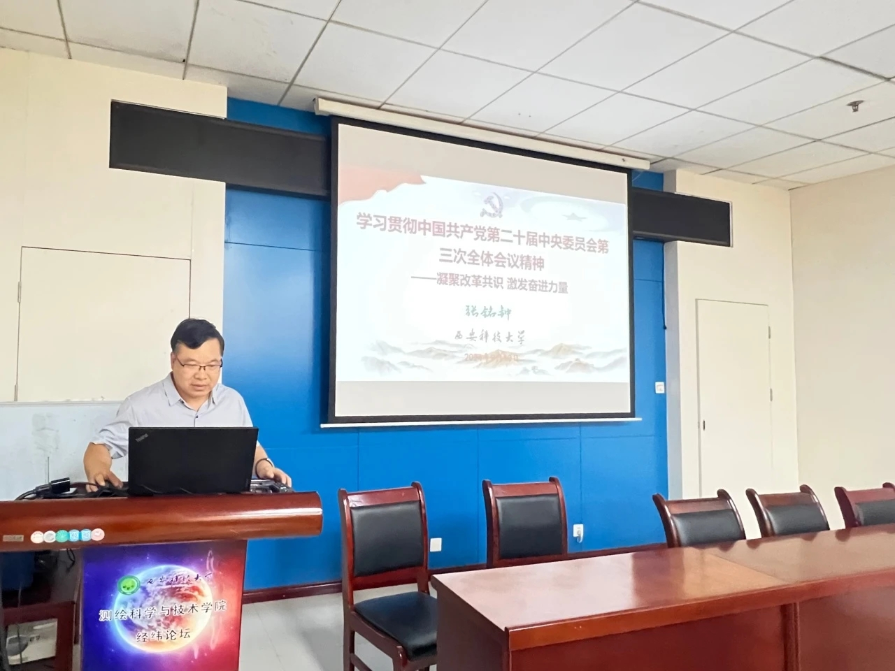 9月10日下午,测绘学院按照校党委安排部署,在雁塔校区煤科大楼511召开学习贯彻党的二十届三中全会精神宣讲报告会,学院邀请马克思主义学院副院长张铭钟教授为全体教师、学生代表进行了透彻深入的宣讲、鲜活生动的解读,会议由学院院长李朋飞主持。