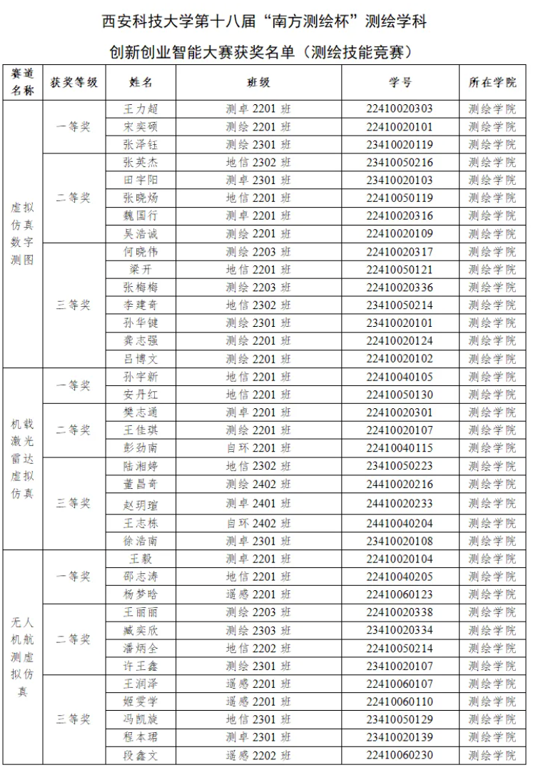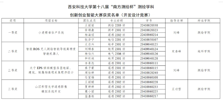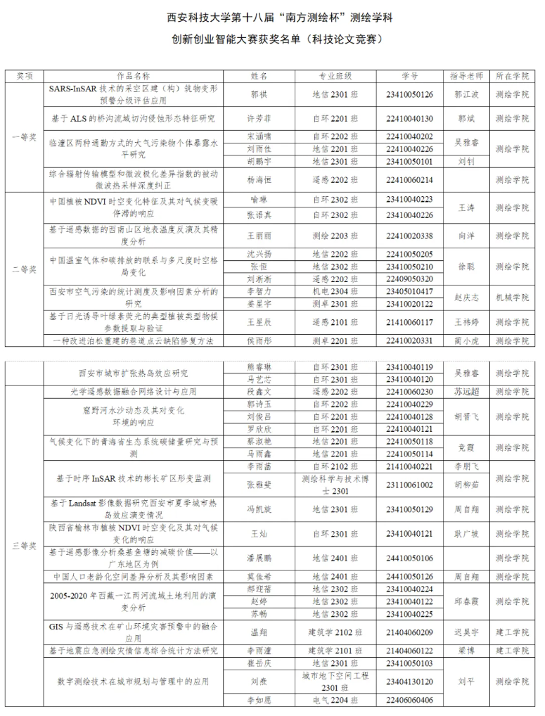 根据中国测绘学会教育工作委员会《关于举办2024年全国大学生测绘学科创新创业智能大赛的通知》,为深化教育教学改革、强化学生实践创新能力培养,充分发挥我校测绘学科优势特色,通过“以赛促学、以赛促创”的模式,由教务处主办,测绘学院承办的第十八届“南方测绘杯”测绘学科创新创业智能大赛顺利举行。本次竞赛全校共有133组学生队伍成功报名参赛,经训练、预赛、决赛,最终成绩由评审专家组评审,共评出一等奖13项,二等奖20项,三等奖31项,现将获奖名单予以公布