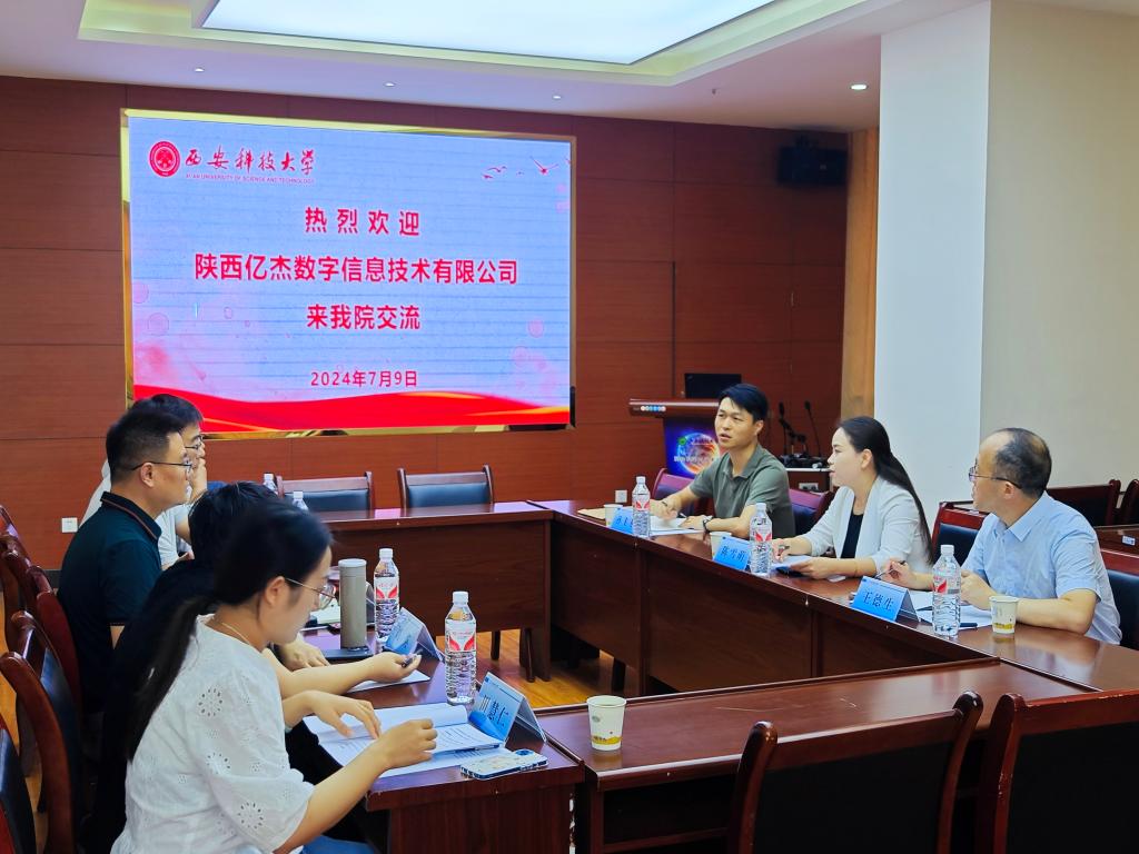 7月9日上午,陕西亿杰数字信息技术有限公司总经理陈雪萌、副总经理王德生、总工程师孙飞飞一行来我院调研交流。院长李朋飞、副院长史晓亮、遥感系主任刘英老师、地信系主任张东海老师、教师代表田慧仁老师参加了交流会。