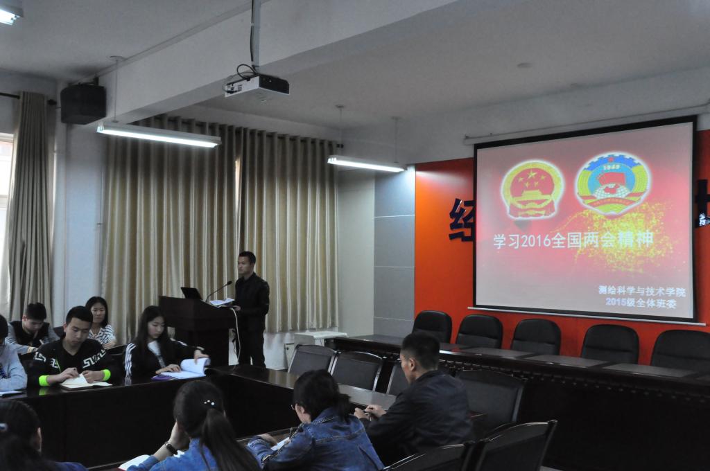 张雷老师从两会的基本知识、2016年政府工作报告解读、2016年两会热点解读做了细致阐述。会议最后,张雷老师表示国家的发展离不开我们每一个人的努力和付出,个人的发展需要国家提供环境和保障,两者相辅相成,不可分割。作为当代大学生,肩负祖国发展前进的伟大使命,必须深入贯彻落实两会精神,同学们应该在学习与讨论中共同进步,力求做一名具备良好思想觉悟的新一代合格大学生。