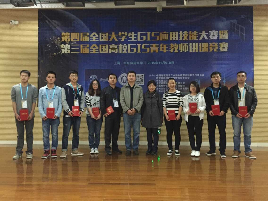2015年11月5-7日在华东师范大学召开第四届全国大学生GIS应用技能大赛、第三届全国青年教师讲课竞赛,经过我院地信工程系老师们为期一个月的集中培训,由夏文海老师和李奇虎老师指导的学生余成成、刘克治、丹杨、宋慧琴、卫靖怡、叶发乾、张鹏、孙哲等两个代表队代表我校参加了此次比赛,分别获得团队二等奖和团队优秀奖。此外,李奇虎老师在第三届全国高校GIS青年教师讲课竞赛中获二等奖。
