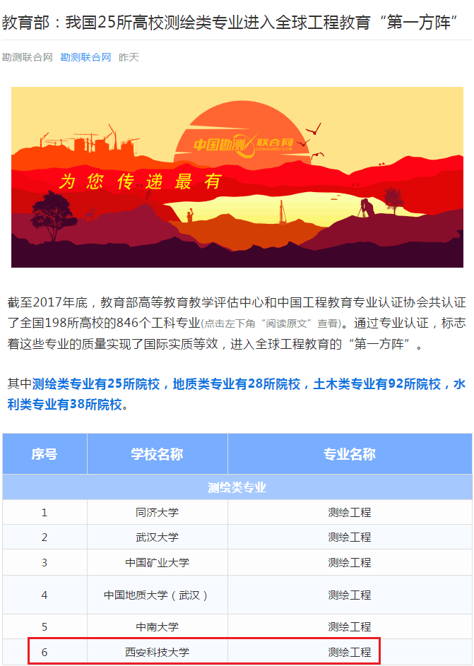 根据教育部近日发布消息,截至2017年底,教育部高等教育教学评估中心和中国工程教育专业认证协会共认证了全国198所高校的846个工科专业。其中,我院测绘工程专业通过认证,并在测绘类专业25所院校中位列第六,标志着我院这一专业的质量实现了国际实质等效,进入全球工程教育的“第一方阵”,这是测绘学院取得的令全省瞩目的历史性突破的成绩。