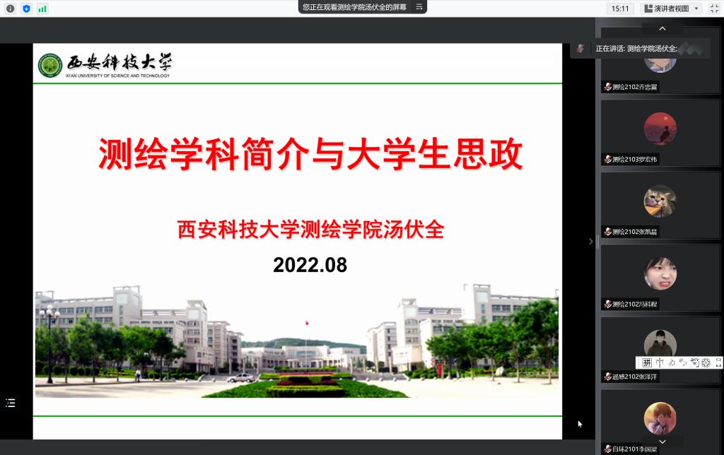 2022年8月22日下午,测绘科学与技术学科带头人汤伏全教授为21级军训生作了“测绘学科简介与大学生思政”报告,院党委副书记郝卿主持。