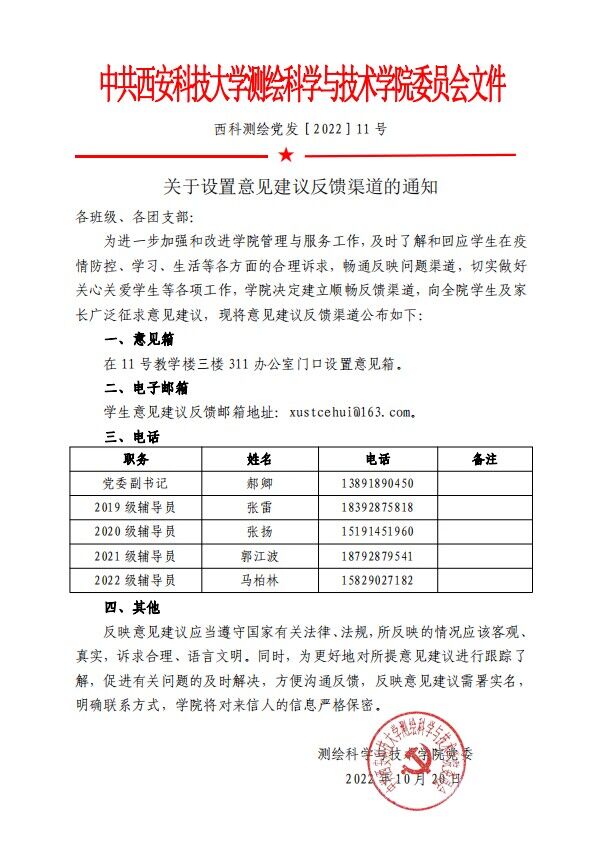 三是畅通学生意见和建议反馈渠道。通过建立专用邮箱以及线下反馈地点,及时向全院学生公布,目的是帮助解决学生实际困难,建立健全学生意见建议收集、处理和反馈工作机制,全力做好学生的服务保障工作,倾听学生心声,共促学生发展。