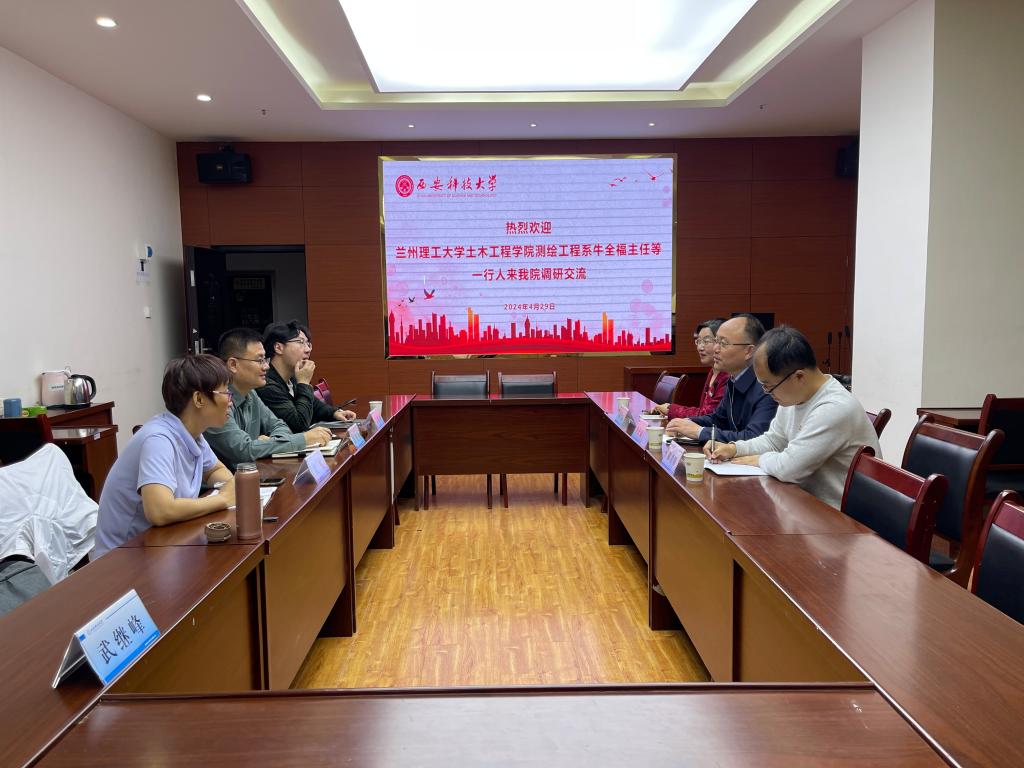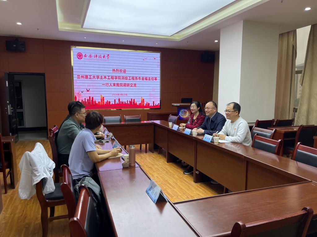 4月29日上午,兰州理工大学土木工程学院测绘工程系系主任牛全福、杨育丽老师、郝君明老师一行来我院调研交流。测绘学院院长李朋飞、副院长竞霞、测绘工程系党支部书记吴啸龙参加了交流会。