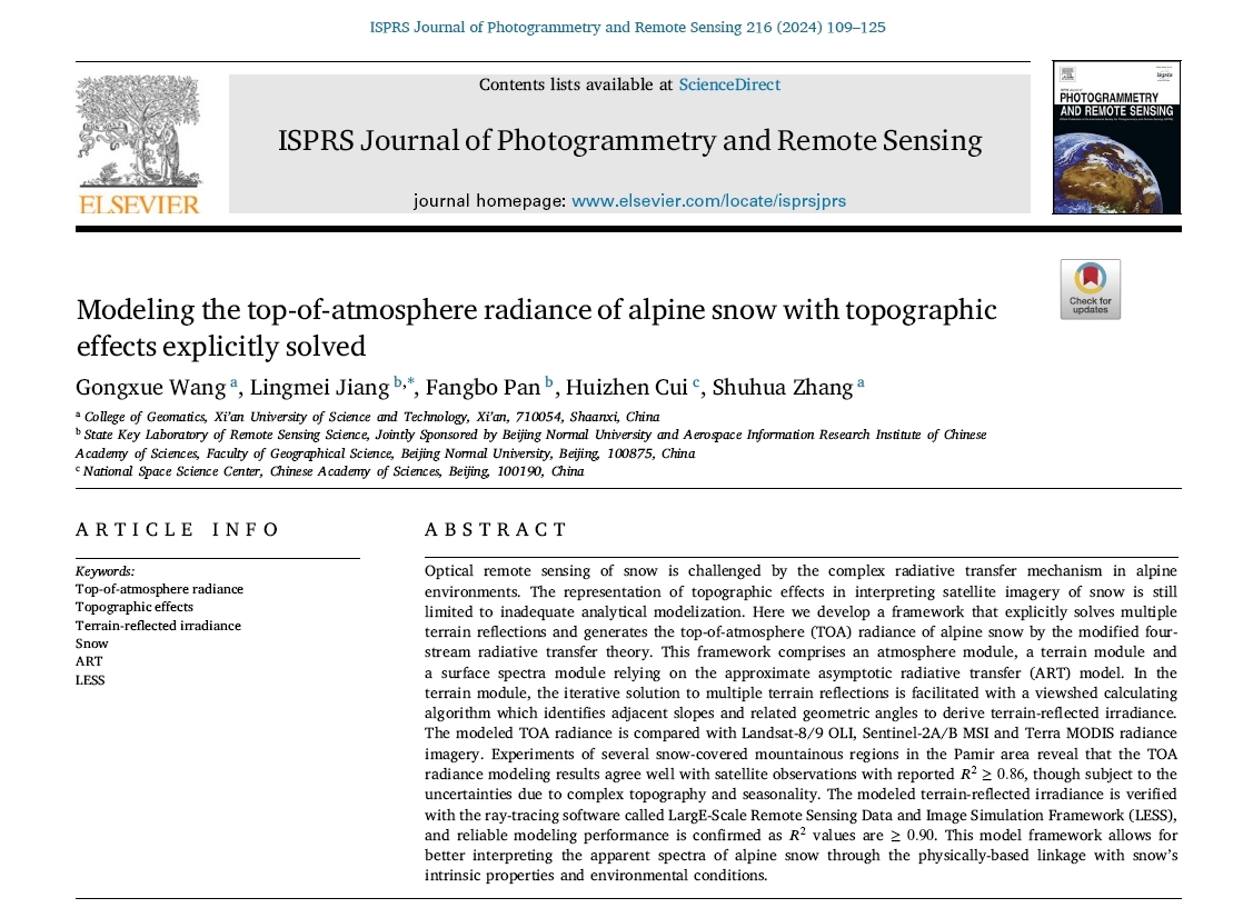 近日,米兰中国官方测绘学院矿区定量遥感研究团队在摄影测量与遥感领域国际顶级期刊ISPRS Journal of Photogrammetry and Remote Sensing(ISPRS P&RS)发表了题为“Modeling the top-of-atmosphere radiance of alpine snow with topographic effects explicitly solved”的研究成果,王功雪讲师为第一作者,张淑花副教授为共同作者。ISPRS P&RS期刊(中科院一区Top期刊,IF=10.6)被公认为是摄影测量与遥感领域最具权威性的国际期刊之一,主要发表摄影测量、遥感观测、空间信息系统、计算机视觉等领域的理论和方法相关的原创文章。