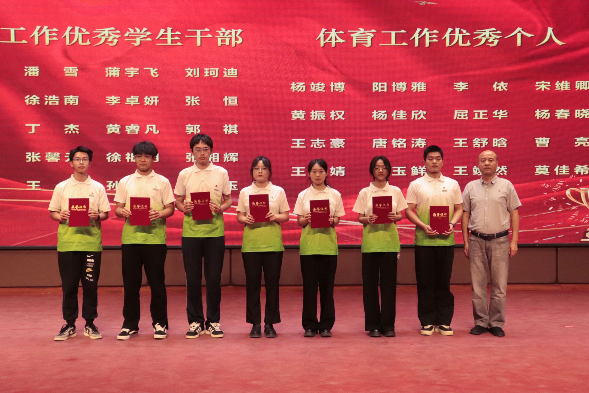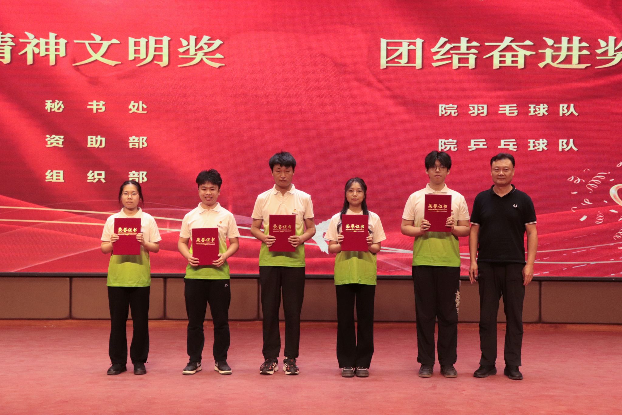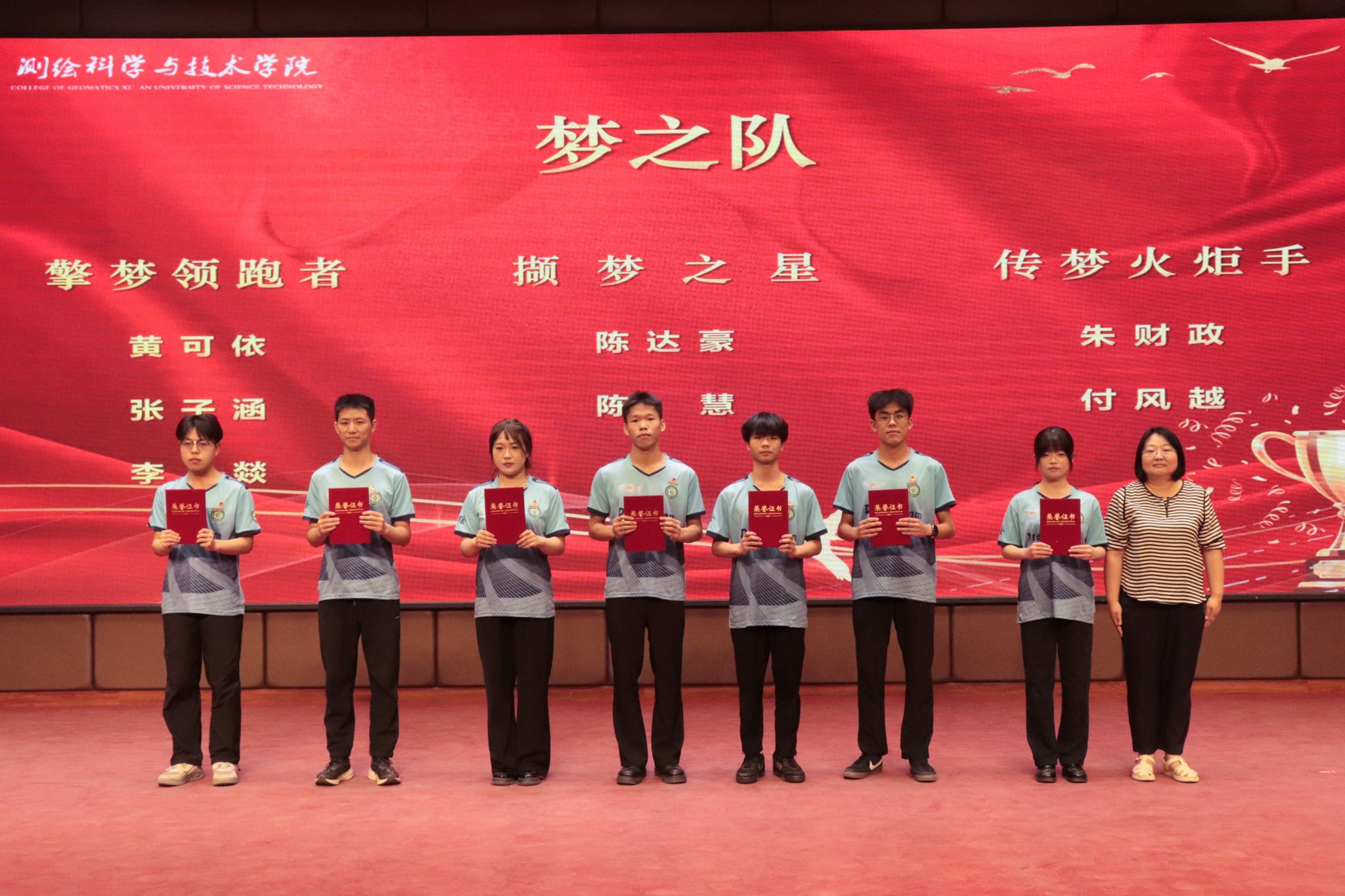 大会第三项,测绘学院院长李朋飞宣读表彰文件,出席会议的领导和老师们分别对体育工作优秀部门、优秀学生干部、优秀个人、团体突出贡献奖、个人突出贡献、优秀运动员、精神文明奖、团结奋进奖、梦之队擎梦领跑者、撷梦之星、传梦火炬手、逐梦先锋、燃梦微光等先进集体和个人进行了表彰。
