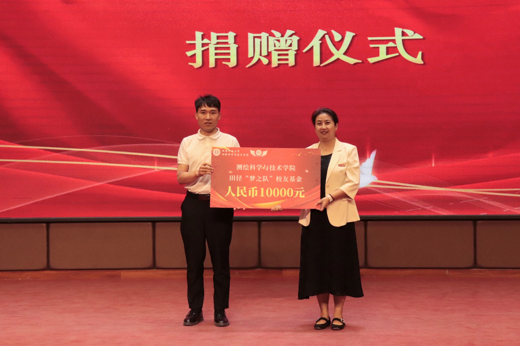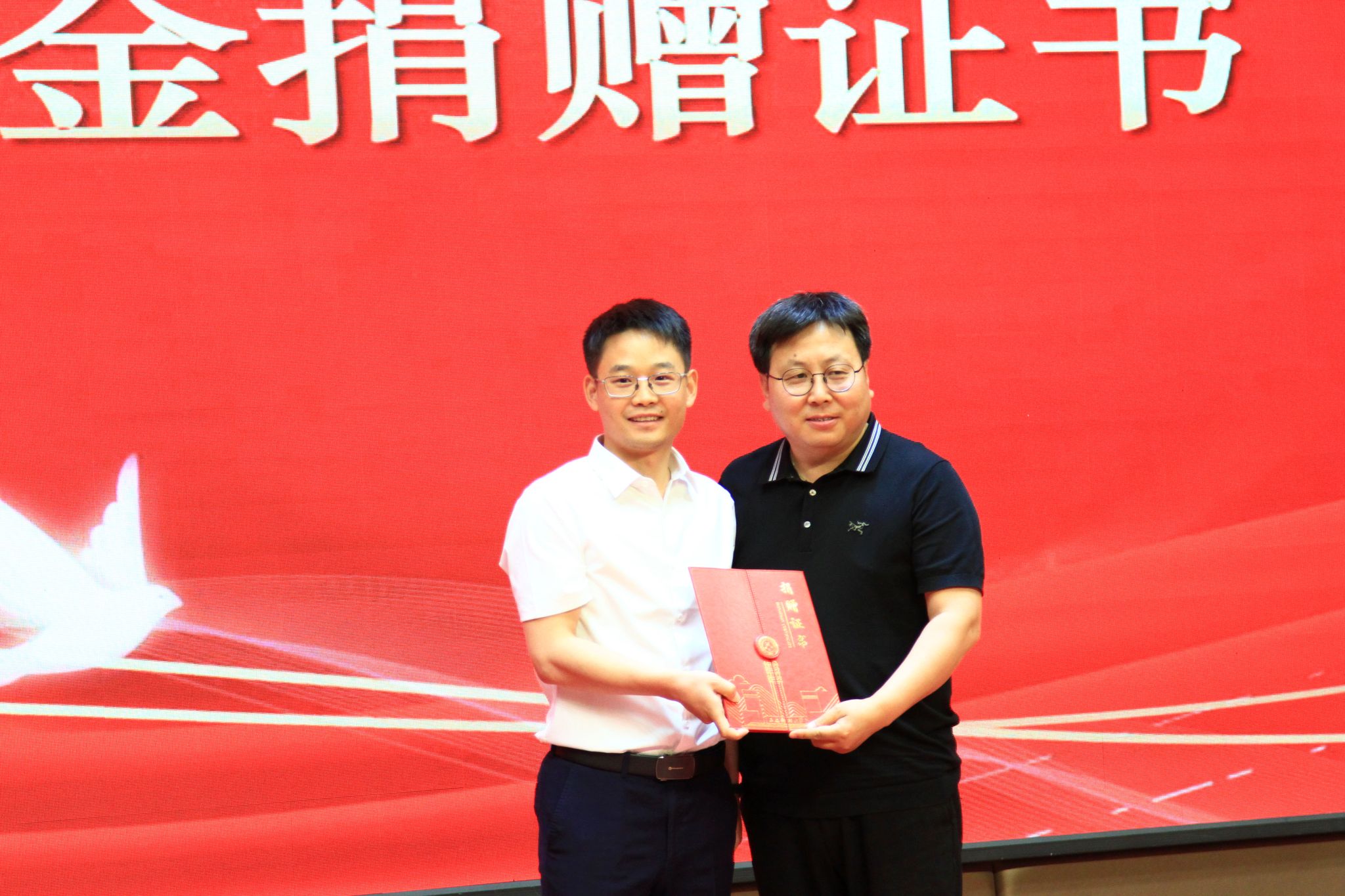 同时,现场举行了捐赠环节,由校友基金发起人之一的校友郑金刚校友上台,由郝卿代表学院接受了这份沉甸甸的心意。