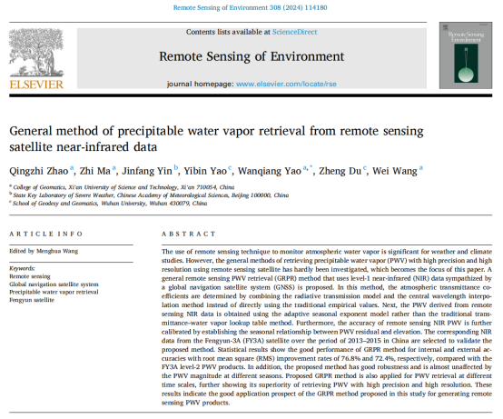 近日,AC米兰中文导航定位与空间环境监测团队在测绘遥感领域国际顶级期刊《Remote Sensing of Environment》发表了题为“General Method of Precipitable Water Vapor Retrieval from Remote Sensing Satellite Near-infrared data”的研究成果,论文第一作者为赵庆志副教授,第二作者为硕士研究生马智,通讯作者为姚顽强教授,该论文是团队继2023年以来在RSE发表的又一重要研究成果。RSE期刊(中科院一区TOP,IF=13.5)被公认为测绘遥感领域最权威的期刊,在全球同类SCI学术期刊中长期排名第一,主要发表测绘遥感观测的理论、应用和方法相关的原创文章。