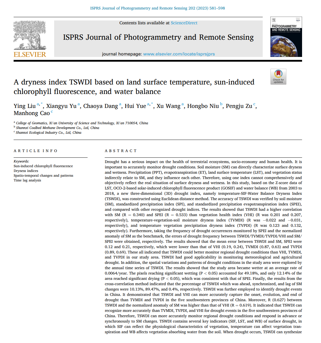 近日,测绘学院矿区定量遥感研究团队刘英、于翔宇(硕士研究生)、党超亚(硕士研究生)、岳辉等,在《ISPRS Journal of Photogrammetry and Remote Sensing》(P&RS)发表了题为“A dryness index TSWDI based on land surface temperature, sun-induced chlorophyll fluorescence, and water balance”的研究论文。ISPRS Journal of Photogrammetry and Remote Sensing(P&RS)是国际摄影测量与遥感学会(ISPRS)的官方期刊。P&RS被公认为遥感领域最具权威性的国际期刊之一,2022年最新影响因子为12.7,5年影响因子为12.4,该杂志为所有国家从事摄影测量、遥感、空间信息系统、计算机视觉和相关领域的许多学科的科学家和专业人员提供了一个交流渠道,旨在作为这些学科进展的来源参考和档案。