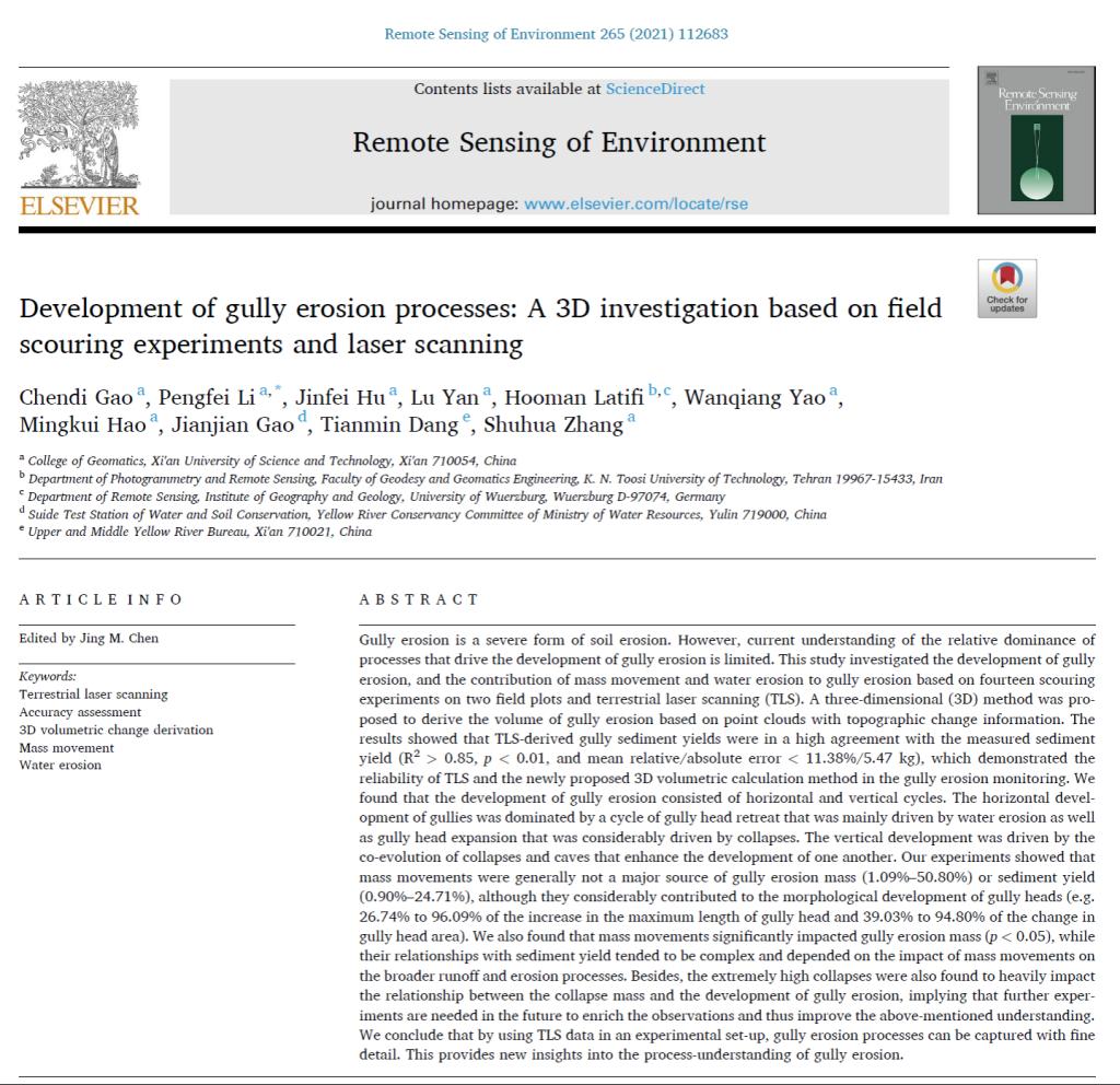 测绘学院地貌遥感与水土保持研究团队高晨迪(博士研究生)、李朋飞、胡晋飞、姚顽强等日前在《Remote Sensing of Environment》(RSE)发表了题为“Development of gully erosion processes: A 3D investigation based on field scouring experiments and laser scanning”的研究论文。RSE被公认为遥感领域最具权威性的国际期刊之一,2021年最新影响因子为10.164,5年影响因子为11.057,主要发表有关遥感的理论、科学、应用和技术的原创成果。