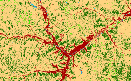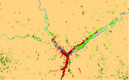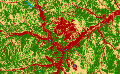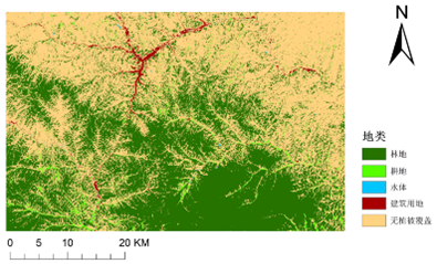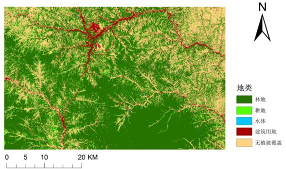 本案例采用支持向量机对研究区进行分类。支持向量机是一种监督分类方法,是一种根据已知类别的样本像元去识别其他未知类别像元的方法。监督分类的基本思想是:从研究区域选取具有代表性的训练样本,依据样本选择参与分类的特征变量,然后根据特征变量的统计特性建立判别函数,据此来识别非样本像元的归属类别。主要环节包括:训练样本的选择、监督分类、分类后评价。图13是分类结果。