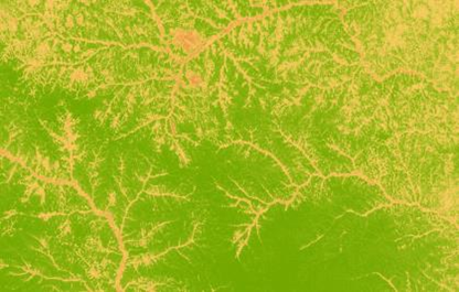 本案例使用归一化植被指数(NDVI)来提取植被信息。NDVI是一种波段组合的衍生特征,其主要原理就是植被在红光波段和近红外波段的反射差异。由于植被在近红外波段强反射、在红光波段强吸收,因而NDVI可以强化这种差异从而反映植被的生长状态。NDVI取值范围为[-1 1]。值越大,植被覆盖越好;值越小,植被覆盖越差。NDVI的计算公式如下: