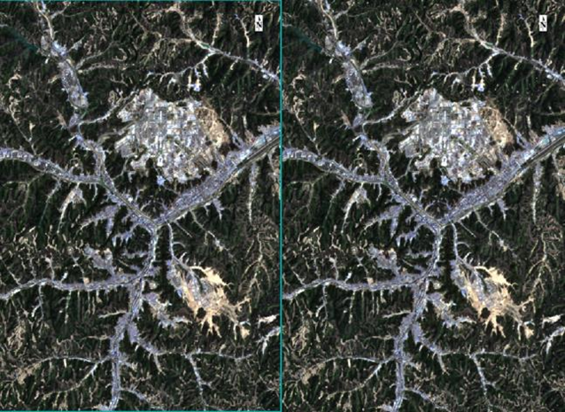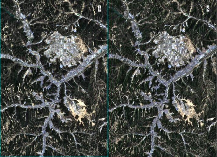 校正由地形因素导致的图像辐亮度的变化称为地形校正。如果地形不平坦,受坡度和坡向的影响,传感器获得的能量也会变化。本案例采用余弦校正方法对影像进行校正。校正结果如图9所示。